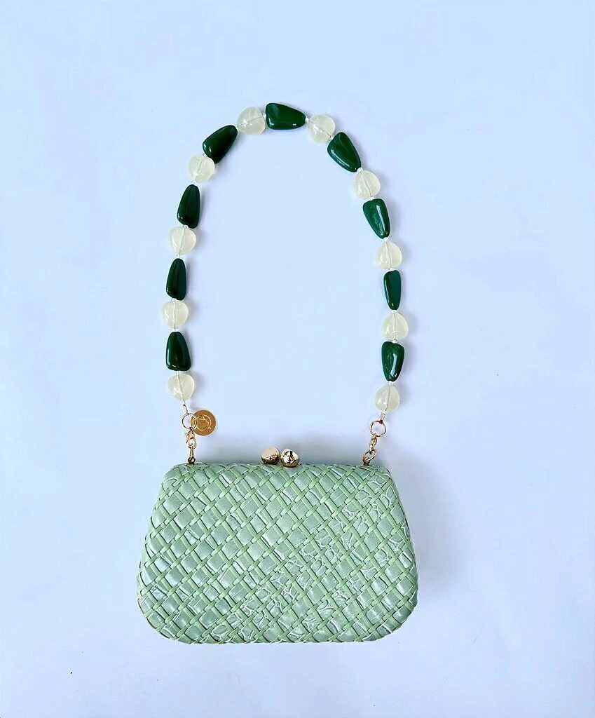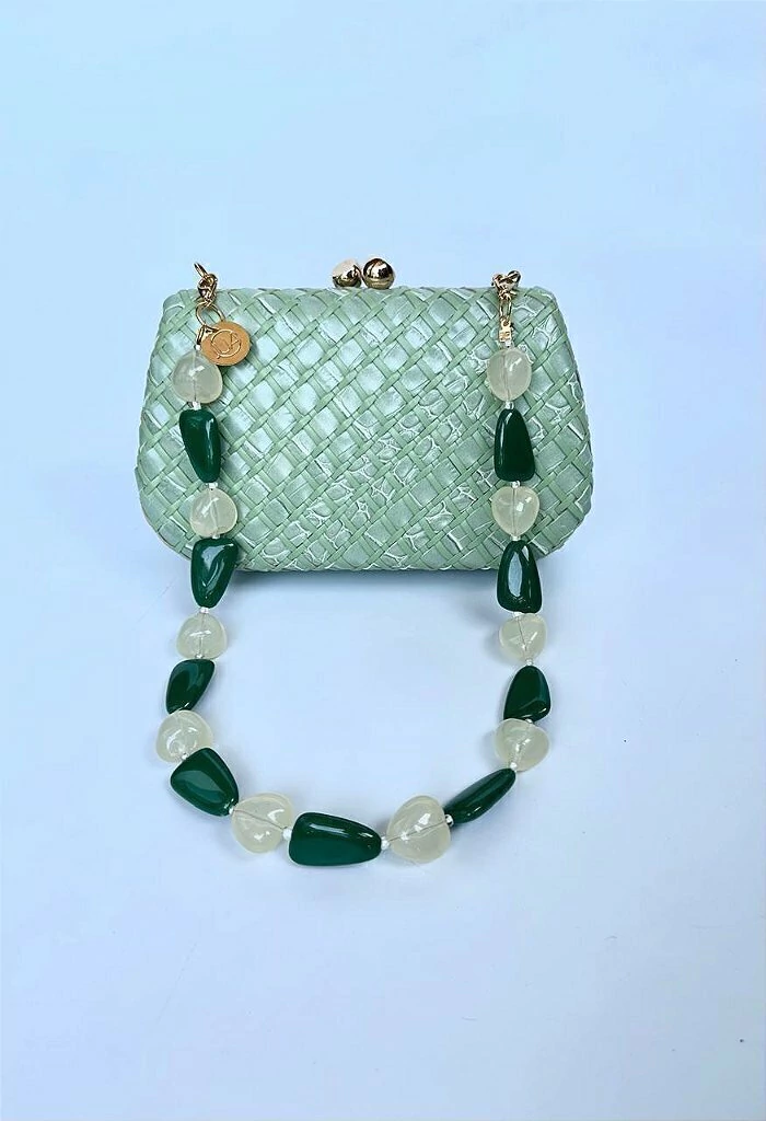 Transforme sua bolsa clutch com a Alça Curta em Pedras Verdes e Transparentes da JUA Concept. É a escolha ideal para quem busca um acessório único que mistura elegância e modernidade, elevando qualquer look.