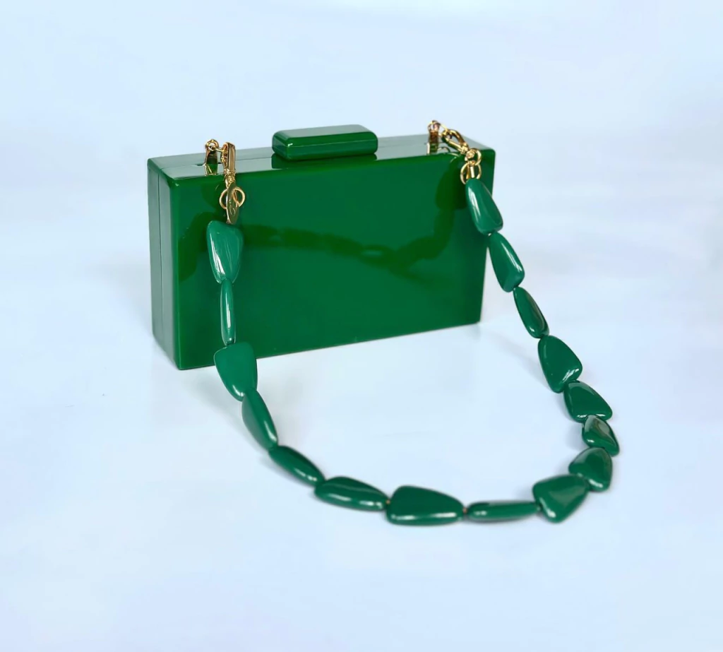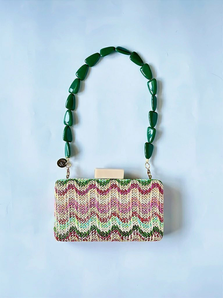 Esta alça curta em pedras acrílicas na cor verde, com formato triangular e acabamento em fecho dourado, é uma escolha original e elegante para personalizar sua bolsa clutch com estilo.