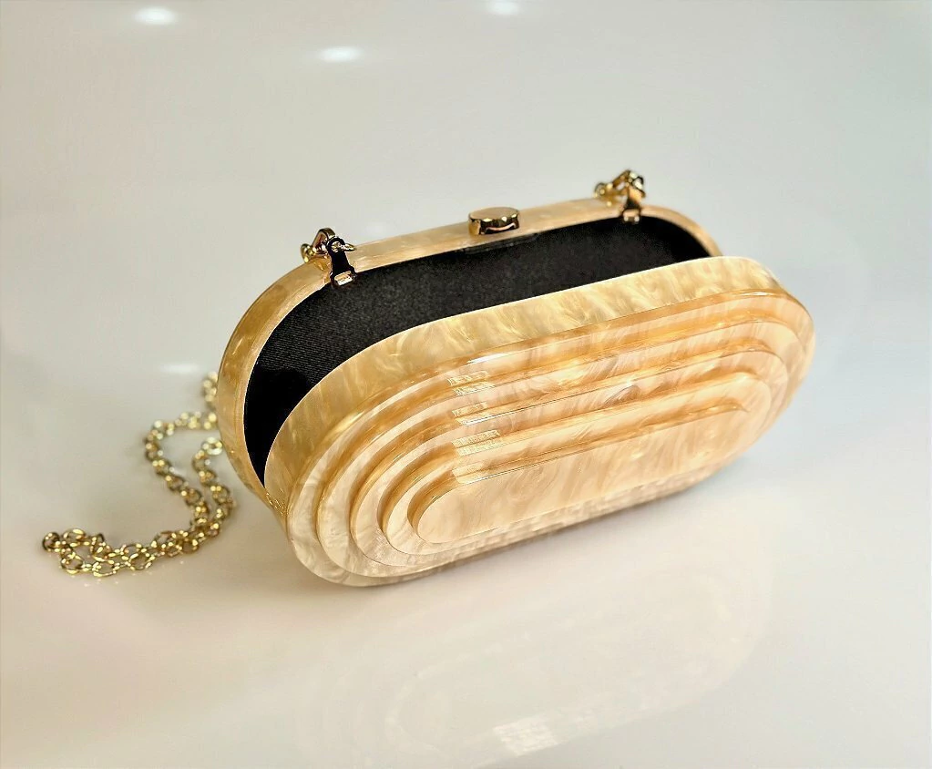 Bolsa Clutch em Acrílico Champagne Perolado com Alça Dourada – JUÁ CONCEPT
