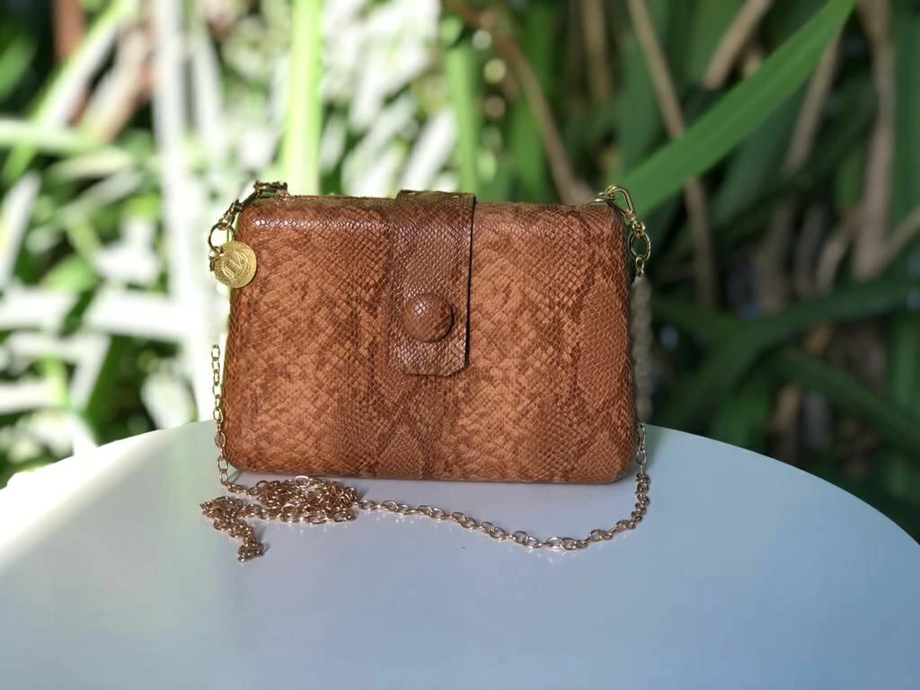 Bolsa Clutch Pitón Cobra Caramelo com Alça Longa Dourada – JUÁ CONCEPT