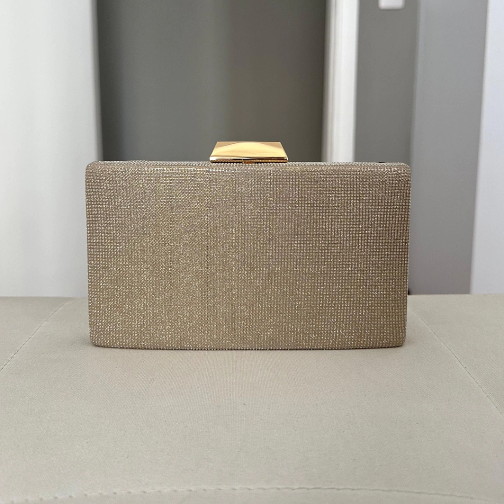 Seu acabamento delicado em tecido com efeito luminoso traz textura e modernidade à produção, sem exageros. Acompanha alça longa removível em metal dourado, oferecendo praticidade para usar no ombro ou transversal.