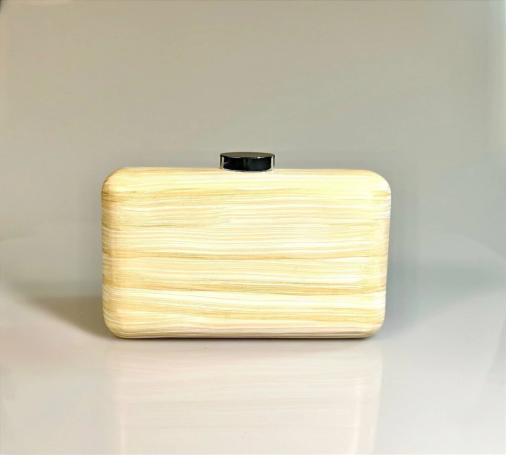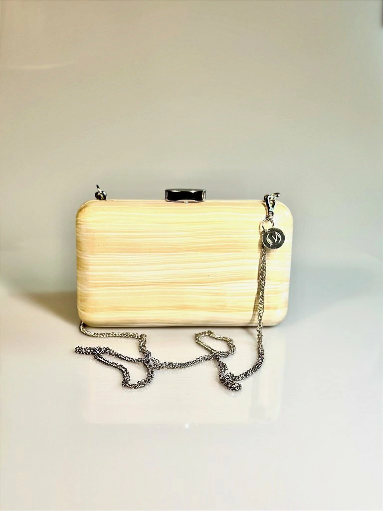 Bolsa Clutch Retangular em Madeira Bege Clara com Alça Prateada – JUÁ CONCEPT