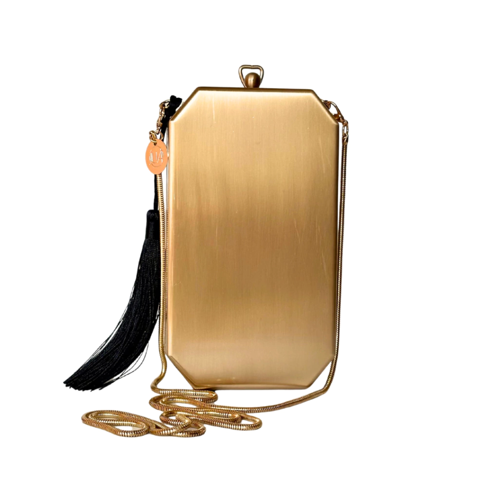 Bolsa Clutch Metal Dourado Cantil com Tassel e Alça Longa – JUÁ CONCEPT