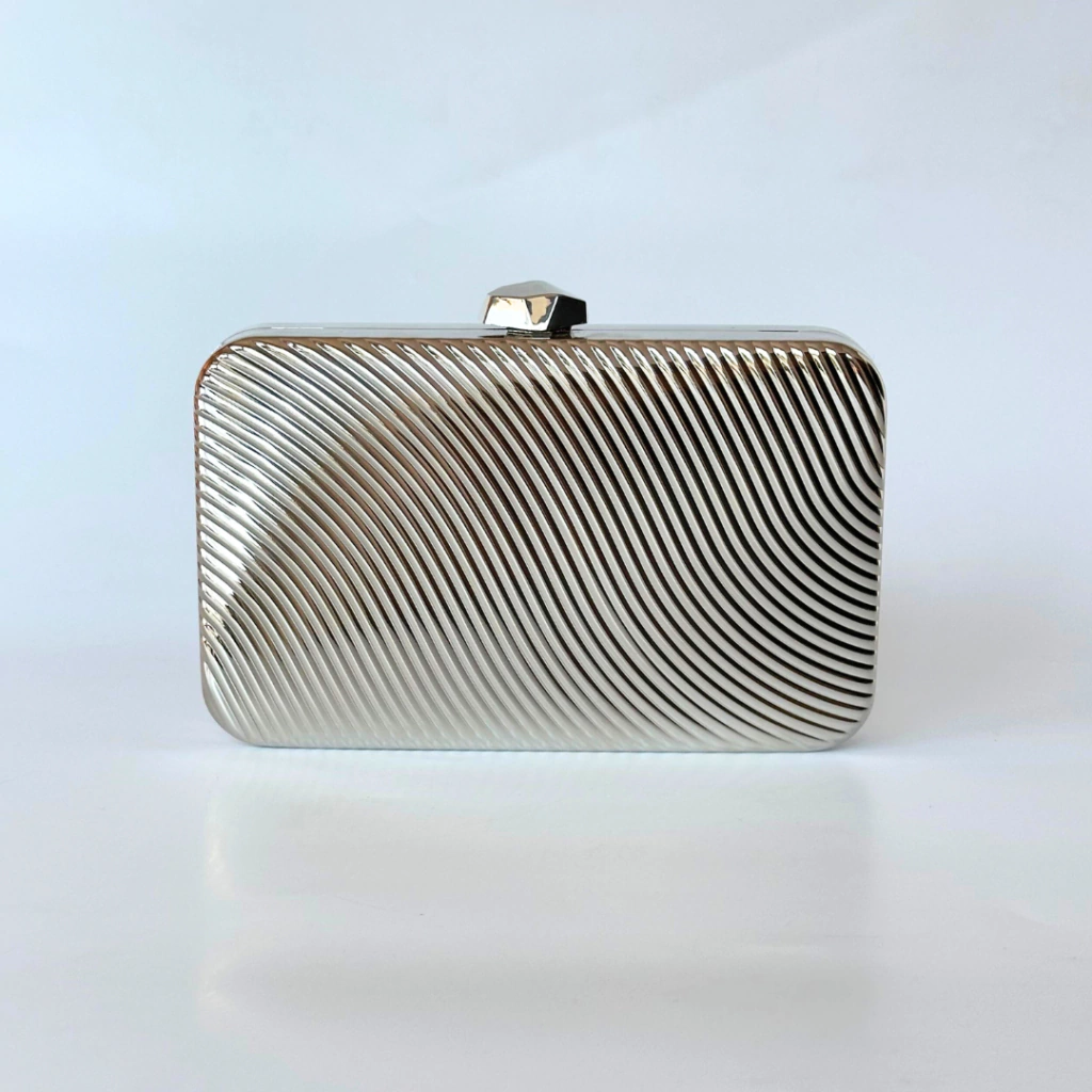 Adicione sofisticação ao seu look com a bolsa clutch em metal prata da JUÁ CONCEPT. Com design retangular moderno e acabamento em baixo-relevo de listras, esta peça é perfeita para quem busca elegância e versatilidade em um único acessório.