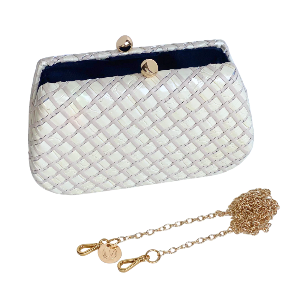 A clutch possui fechamento magnético seguro e acompanha alça longa removível de metal dourado, oferecendo a opção de uso como clutch de mão ou bolsa tiracolo, ideal para diferentes ocasiões – de eventos especiais a produções casuais refinadas.